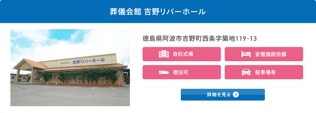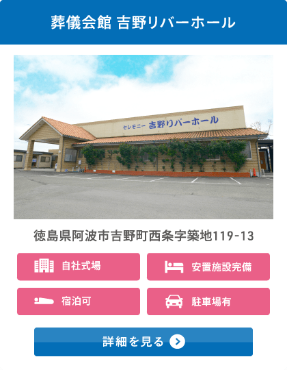 葬儀会館 吉野リバーホールは徳島県阿波市、徳島県上板町、徳島県板野町の地域を中心に地元密着の葬儀社として、